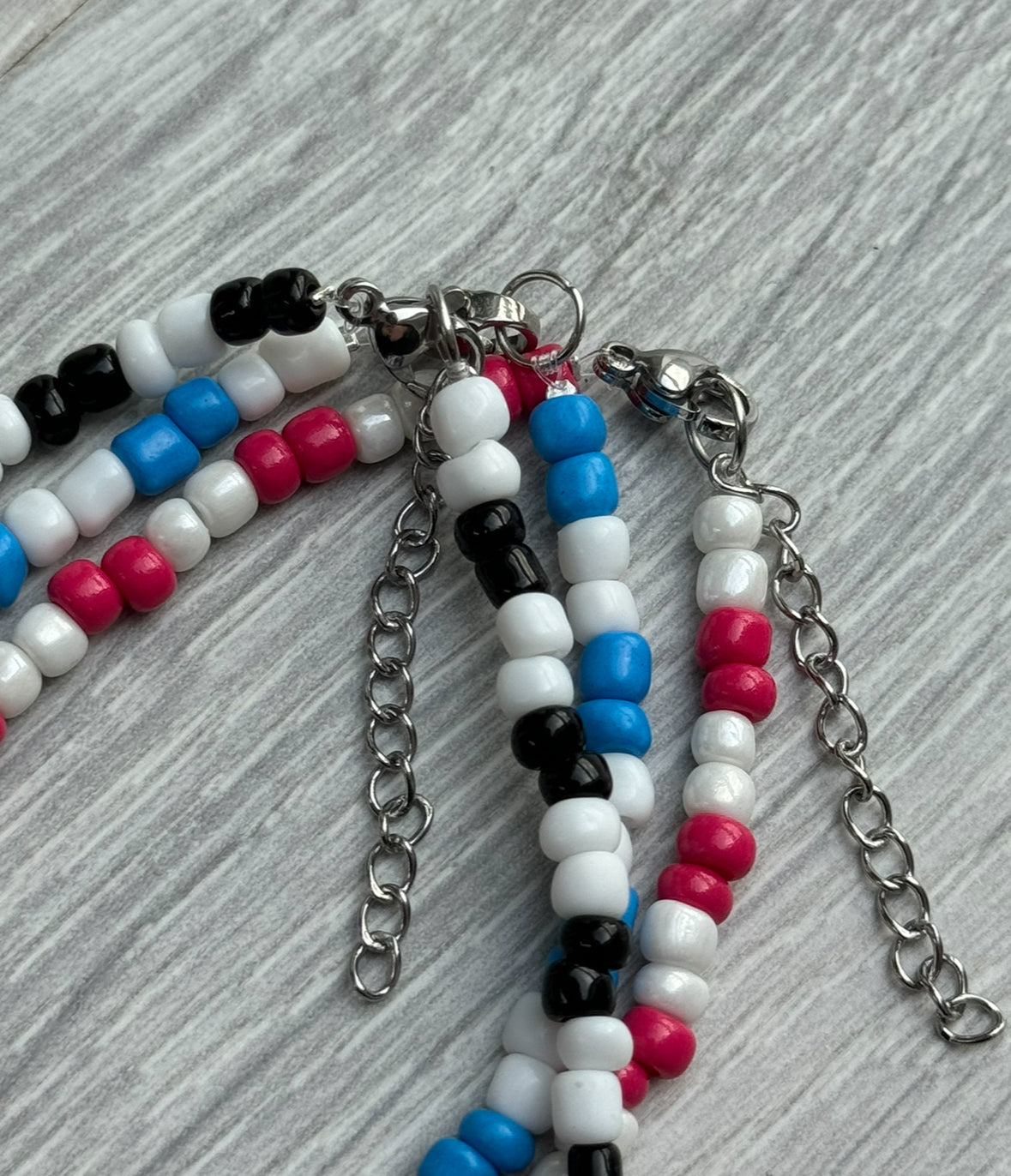 Made using 4mm glass beads and a stainless steel lobster clasp, jump ring and extender chain.