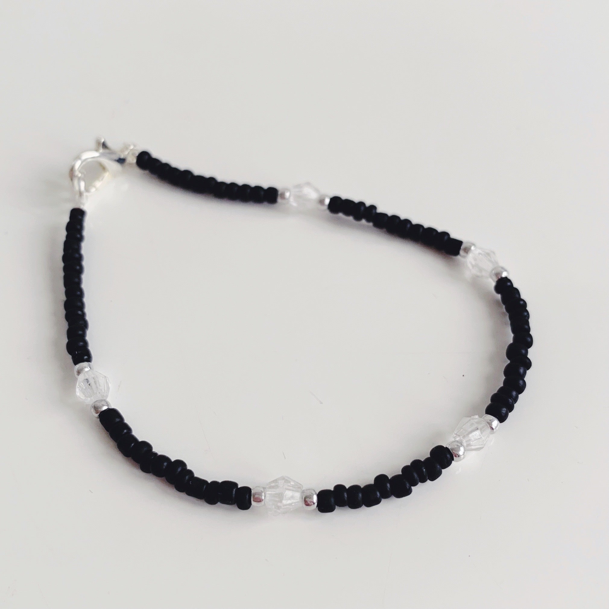 Matte black beads with silver and clear diamanté accents and a black/white flower chain bracelet.