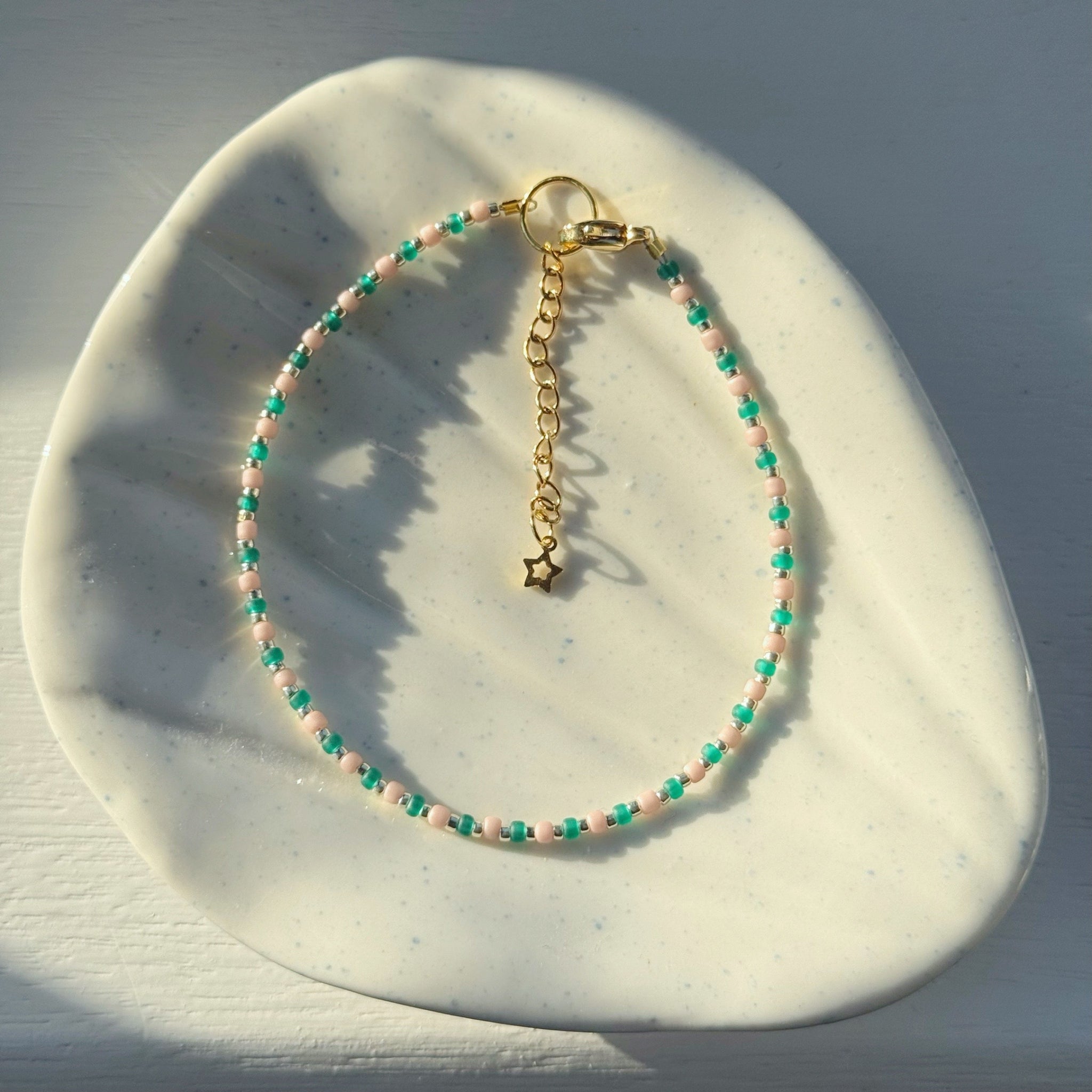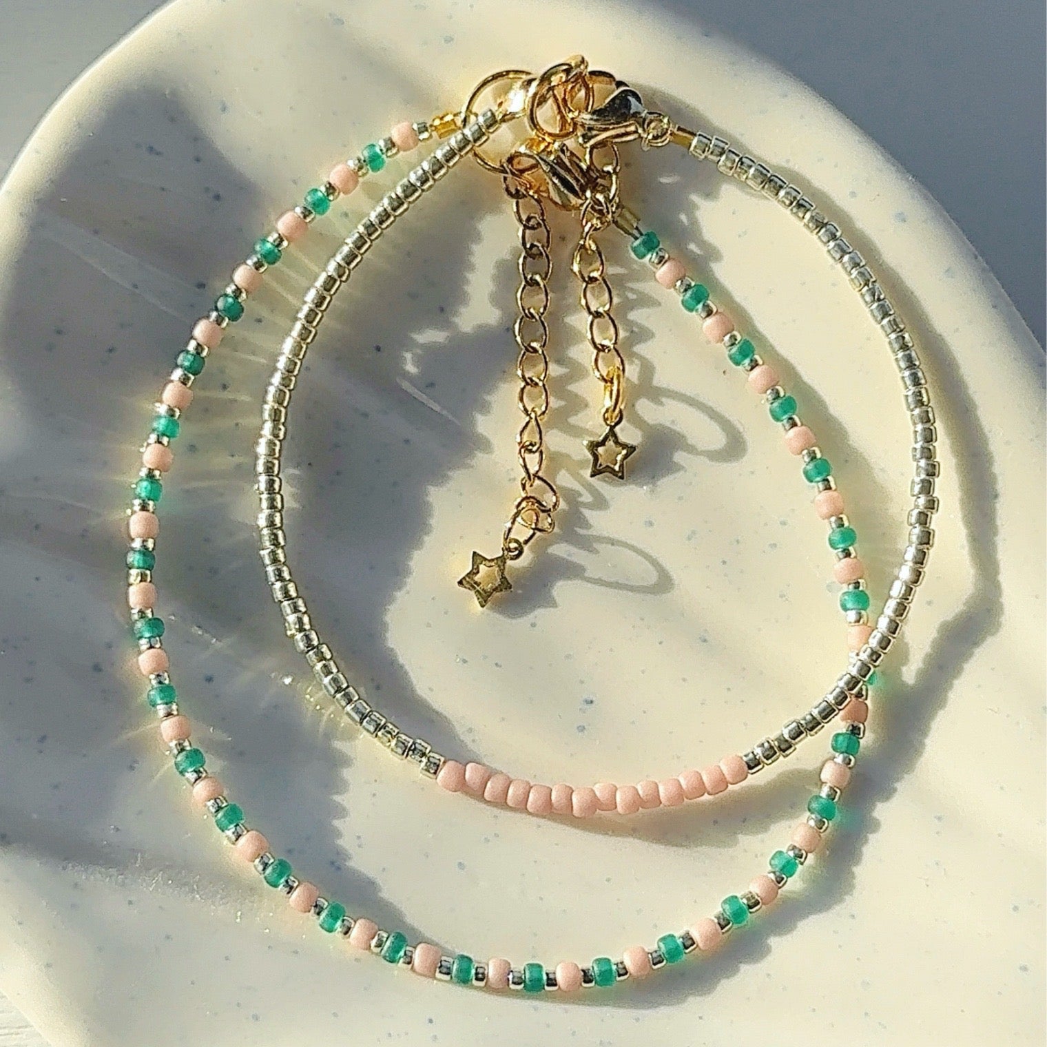 Gold bead bracelet set of 2 - pastel pink and emerald green