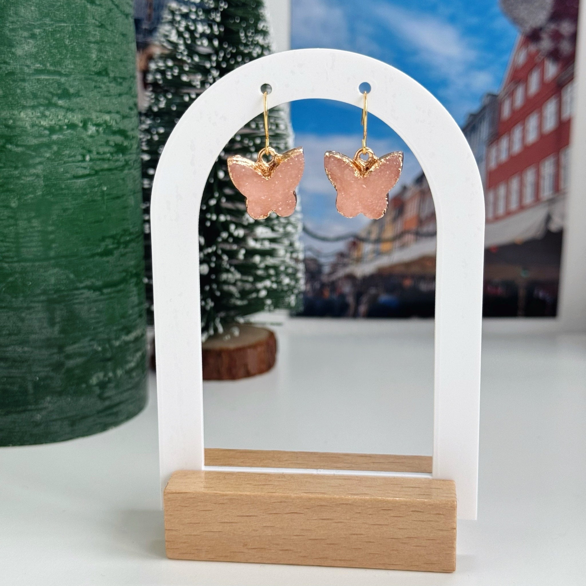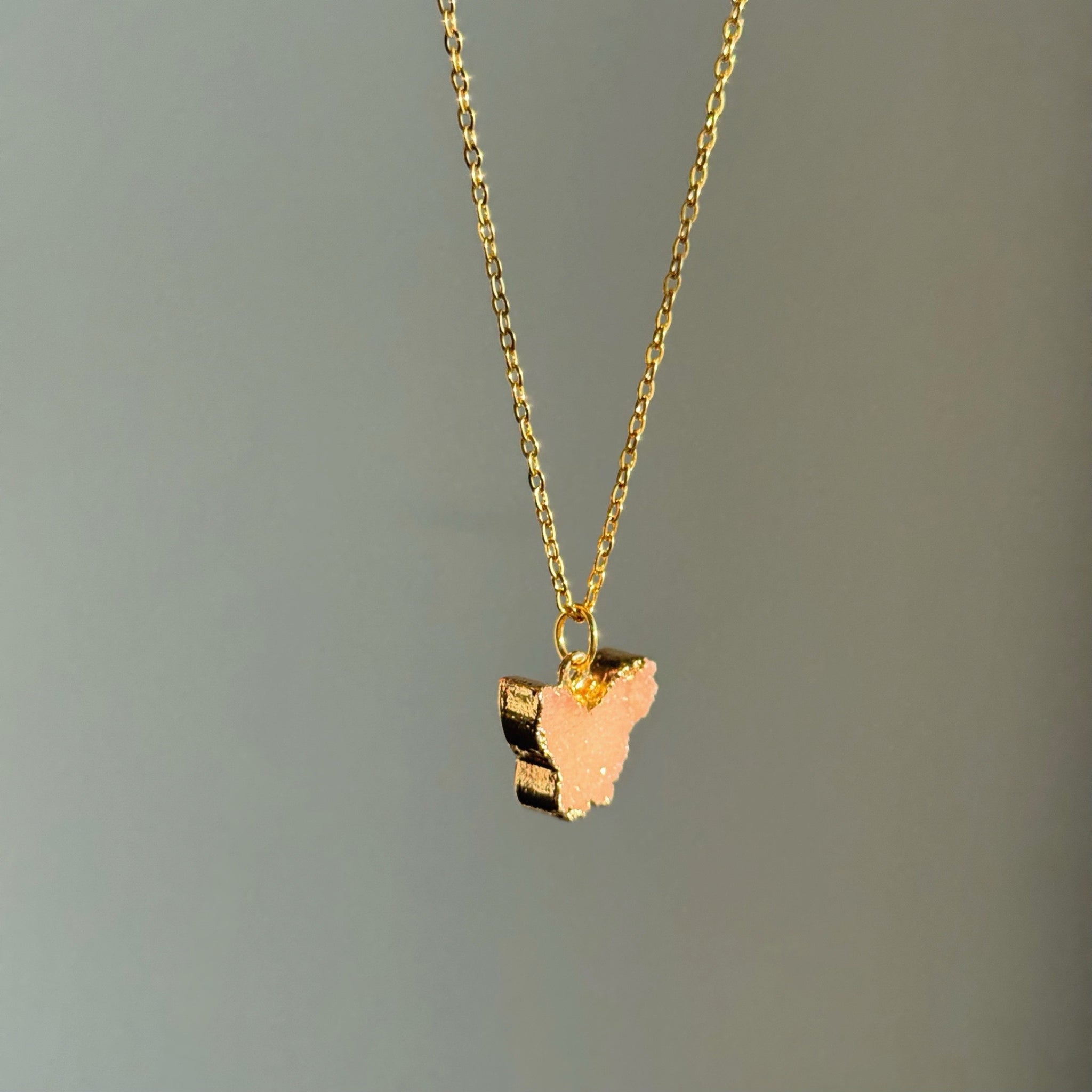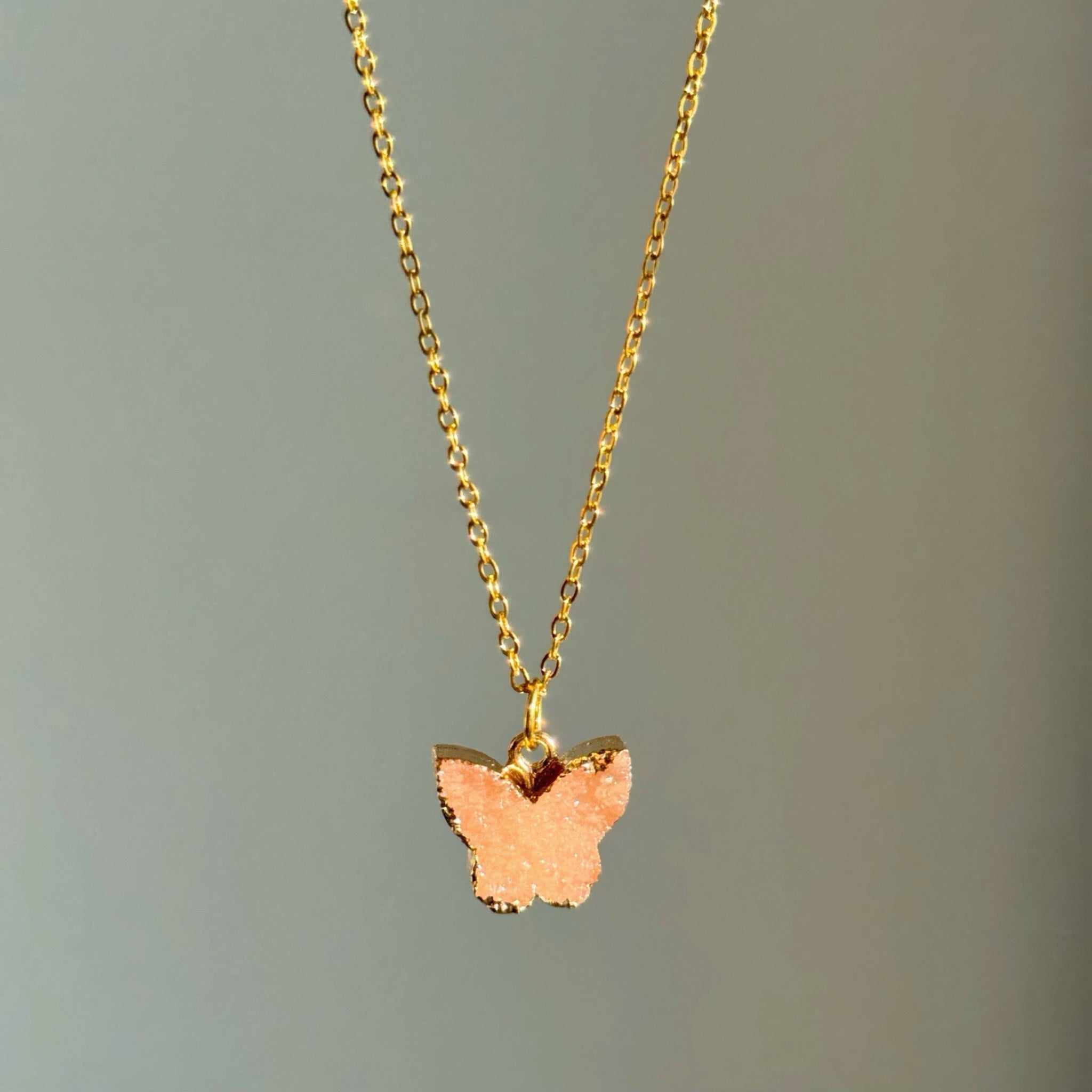 Gorgeous druzy butterfly charm necklace and earrings set. High quality gold plated earring hooks and 18k gold plated fine cable chain.
