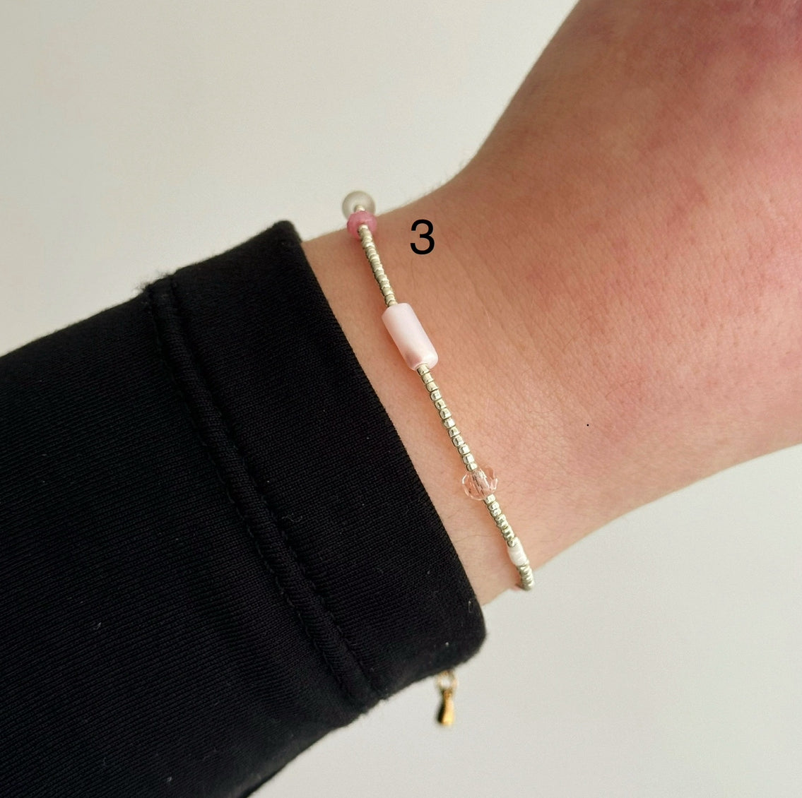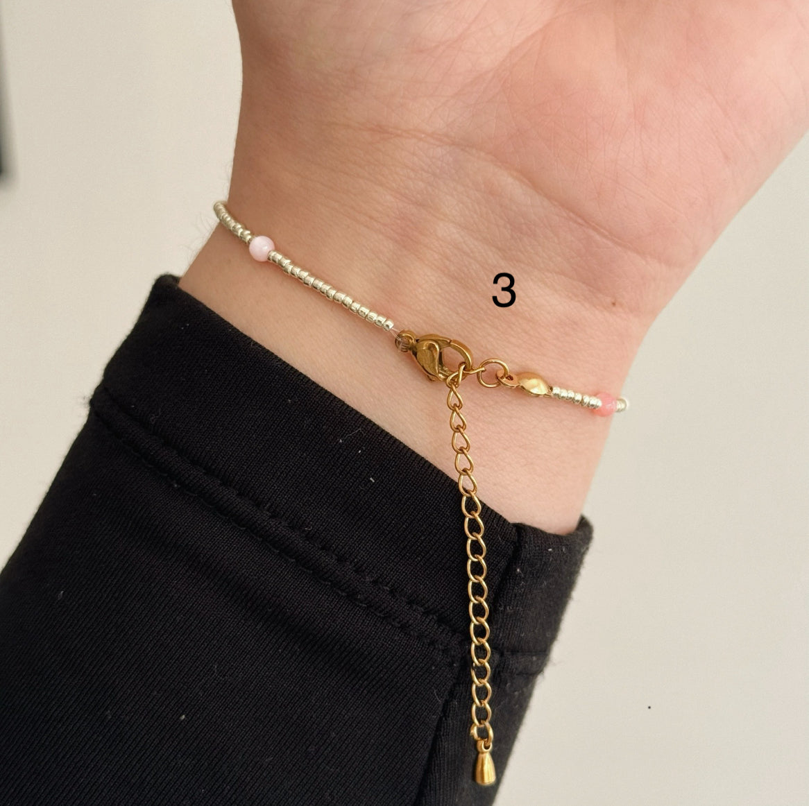 These bracelets (1,2 and 4) are finished with a stainless steel lobster clasp, jump ring and extender chain. Bracelet number 3 is finished with gold plated stainless steel findings.