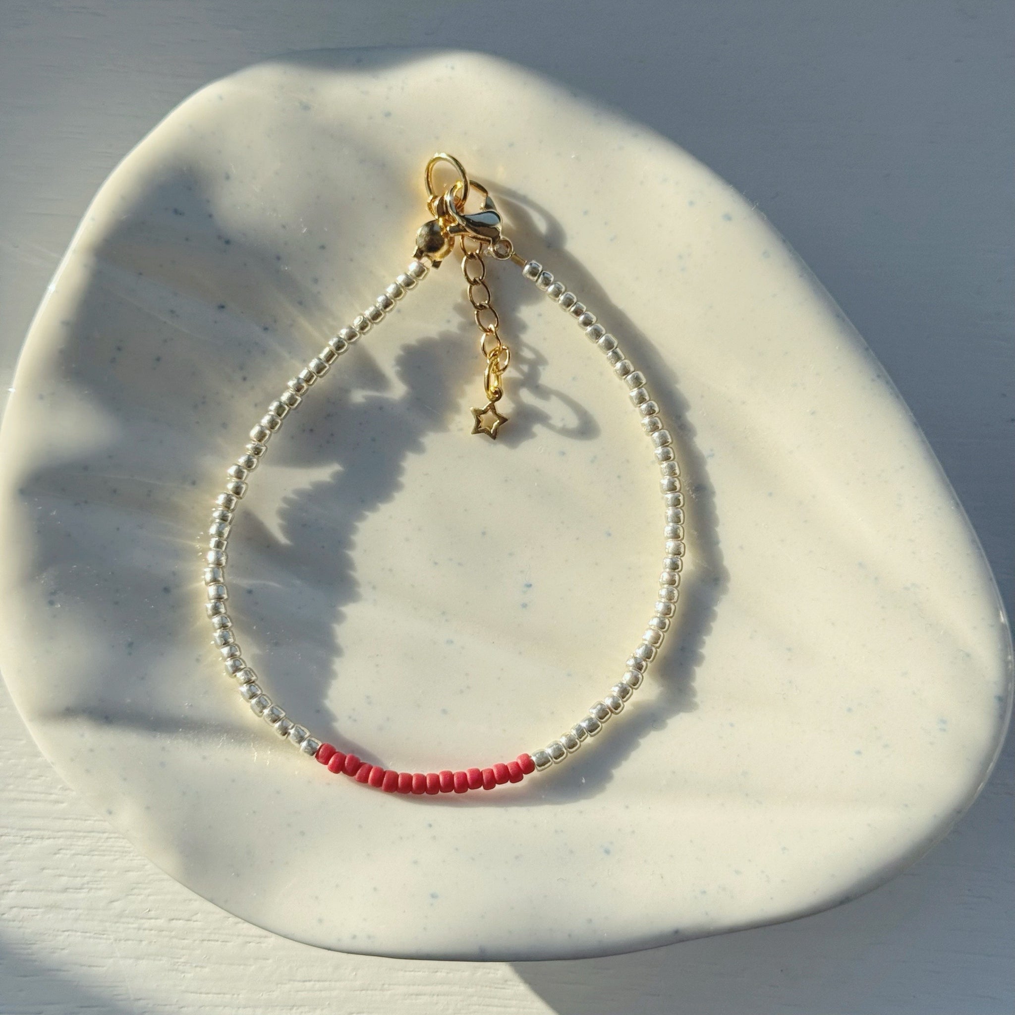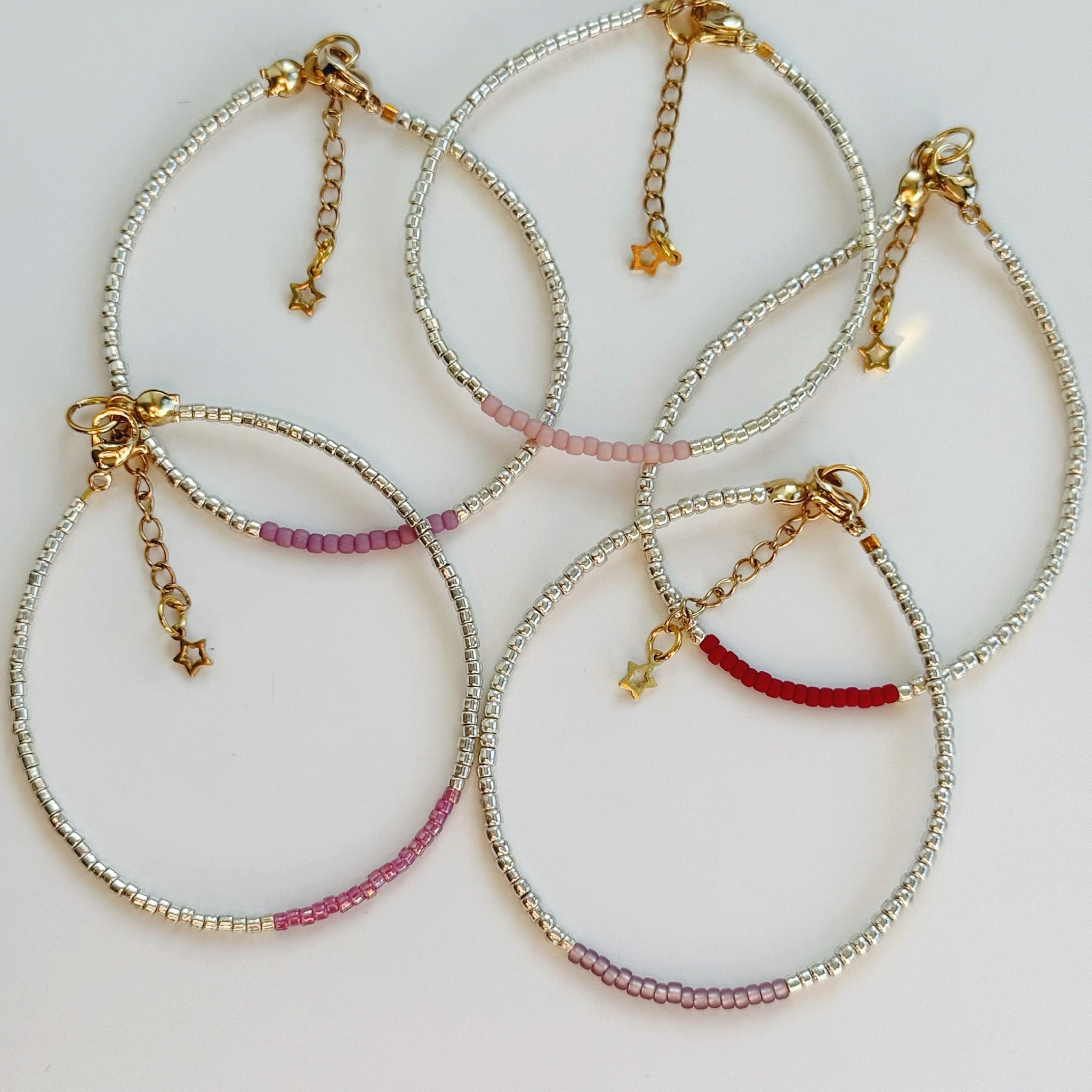 SpudStyle bracelets are made using high quality glass beads, finished with a 24k gold plated stainless steel lobster clasp, jump ring and extender chain.